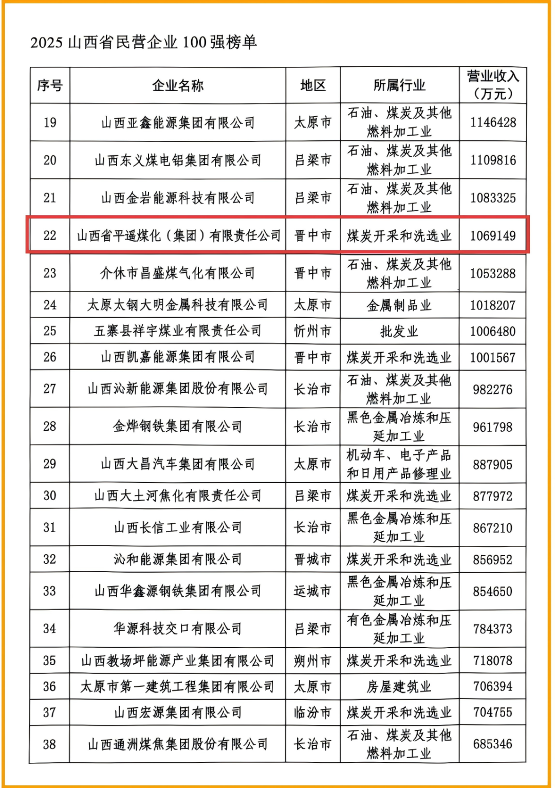 9月18日,山西省工商聯(lián)發(fā)布“2025山西省民營企業(yè)100強”榜單,平遙煤化集團憑借雄厚的經(jīng)濟實力與強勁的發(fā)展勢頭再度登榜,位列第22位。